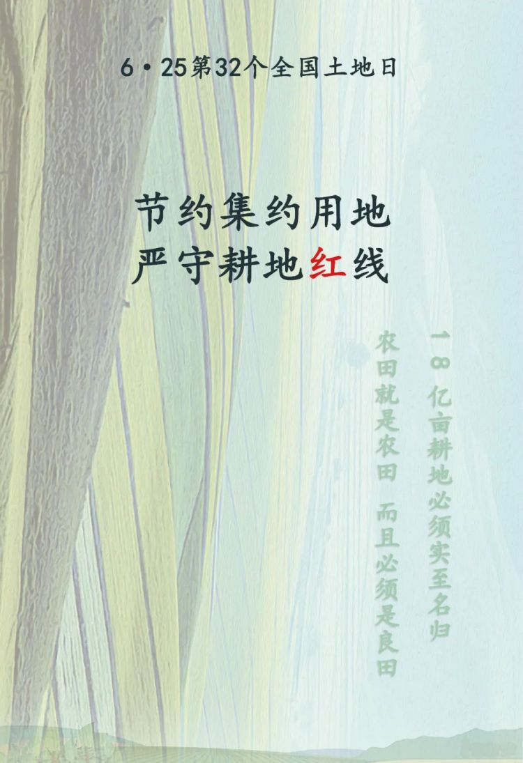 全國土地日是宣傳我國土地資源國情國策,引導(dǎo)社會關(guān)注土地資源保護利用、牢固樹立耕地保護意識的重要宣傳平臺。今年6月25日是第32個全國土地日,主題是“節(jié)約集約用地·嚴(yán)守耕地紅線”。